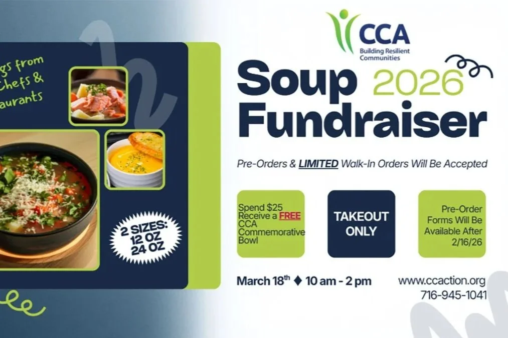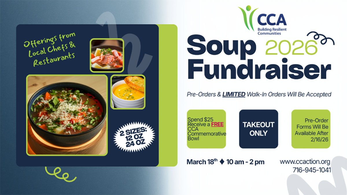 Now is the time to place your pre-order for the soups of your choice! Each order of $25 or more will receive a free CCA commemorative bowl. Those who have questions or would like to receive more information can contact CCA’s main number at 716-945-1041 or email info@ccaction.org.